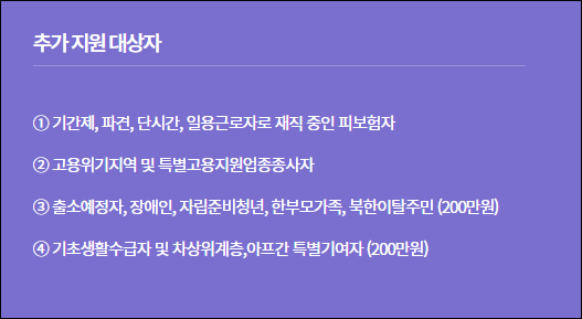 ※ 제외 대상 : 공무원, 사립학교 교직원, 연매출 1억 5천만 원 이상 자영업자, 월평균 급여 300만 원 이상 대기업 종사자(45세 미만), 특수형태 근로 종사자 등